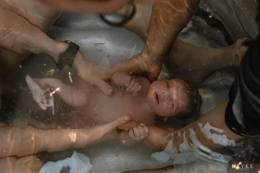 One of twins. Her brother was already born, and the mother’s body suddenly let go of everything. She was born in her waters, with her own placenta and her brother’s like a hat on her head. I’d never before seen a baby born in the waters with the placenta. There’s an old myth in the Netherlands that a child born in the veil brings lifelong happiness. I wish that for this family.