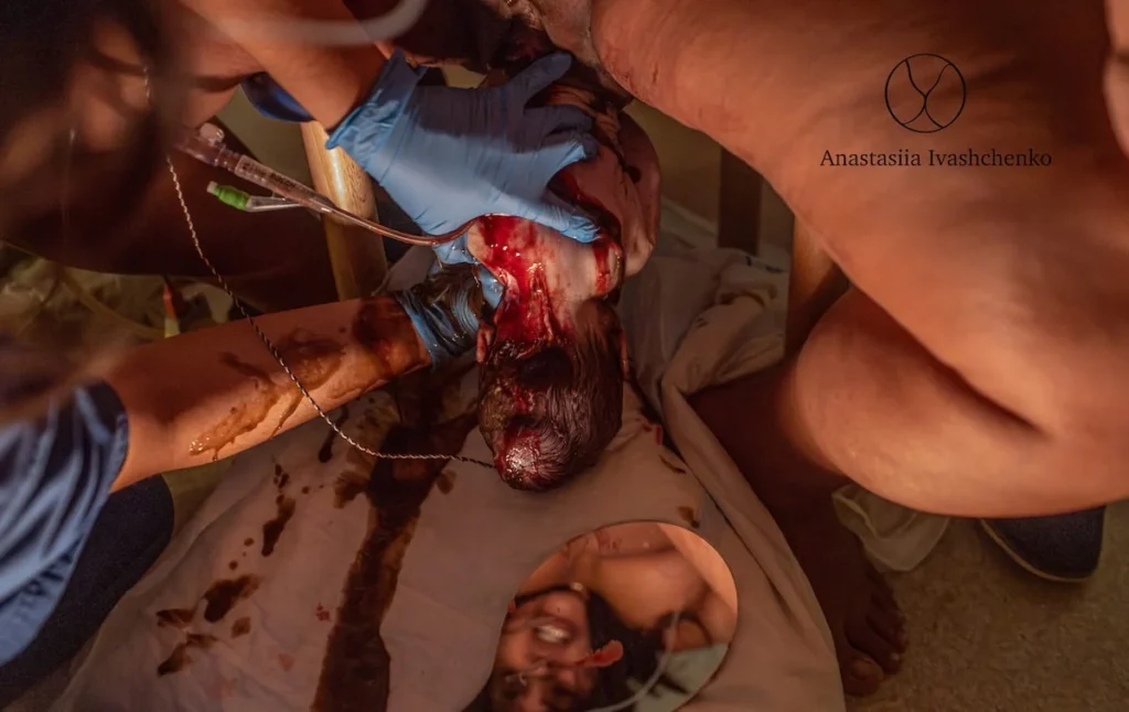 Amniotic fluid streams from baby’s nose and mouth while mother gathers her strength to birth her baby on the next push.