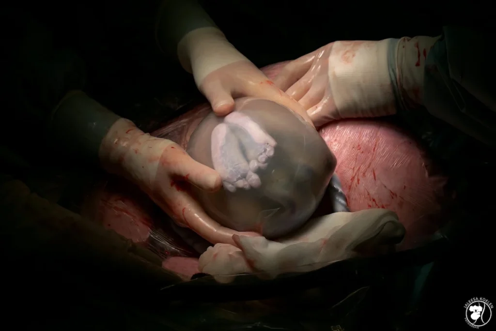 A baby remains safely tucked within the intact amniotic sac during a delivery.